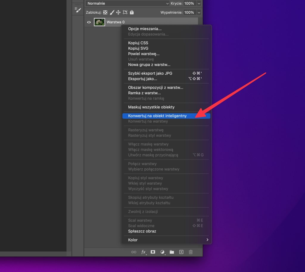 Aby skopiować filtr inteligentny na inną warstwę, musi być ona obiektem inteligentnym. Wystarczy, że zaznaczysz warstwę, a następnie przekonwertujesz ją na obiekt inteligentny, wybierając odpowiednią opcję po kliknięciu prawym przyciskiem myszy.