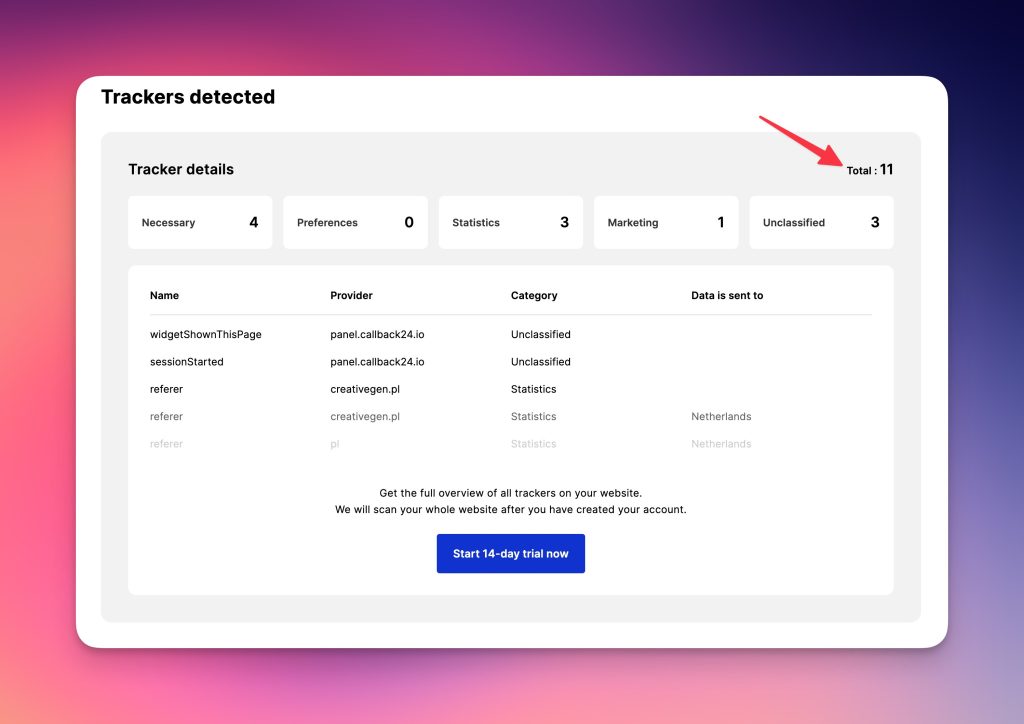 To, co nas interesuje, to sekcja „Trackers detected”. Widzimy, że strona używa łącznie 11 różnych plików cookie. Zerkając niżej, zobaczymy rodzaje plików cookies, co jest również istotne.