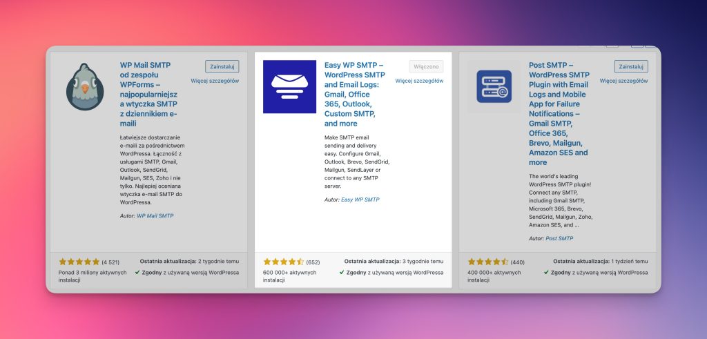 Wykorzystamy do tego wtyczkę Easy WP SMTP. Wyszukujemy wtyczkę w panelu WordPress w sekcji „Dodaj wtyczki”, a następnie instalujemy ją na naszej stronie i włączamy.