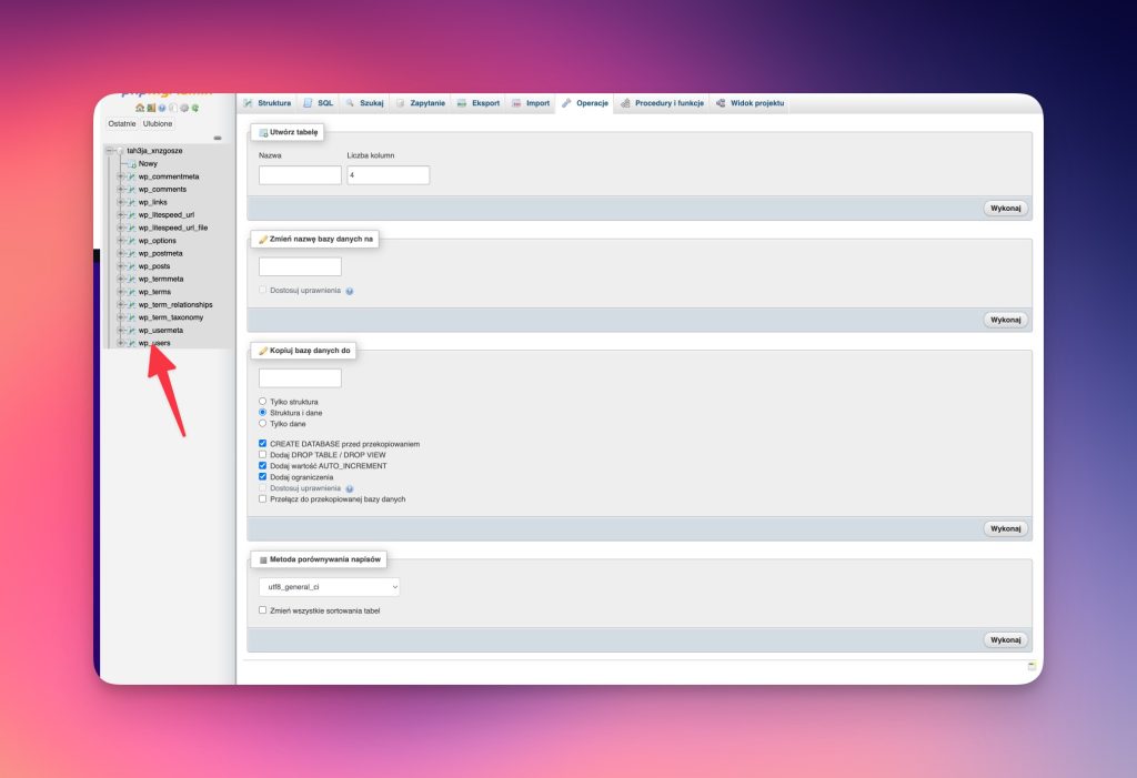 W phpMyAdmin odnajdź tabelę wp_users i przejdź do niej. Tabela może mieć ustawiony niestarardowy prefix i może nazywać się np. wp_1234_users.