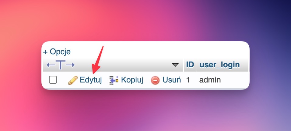 Odnajdź odpowiedniego użytkownika. W kolumnie user_login znajdziesz nazwę użytkownika. Standardowo w WordPress administrator ma login „admin”. Zalecamy jednak, aby nie używać tej nazwy. Klikamy „Edytuj” obok użytkownika, którego hasło chcemy zmienić.