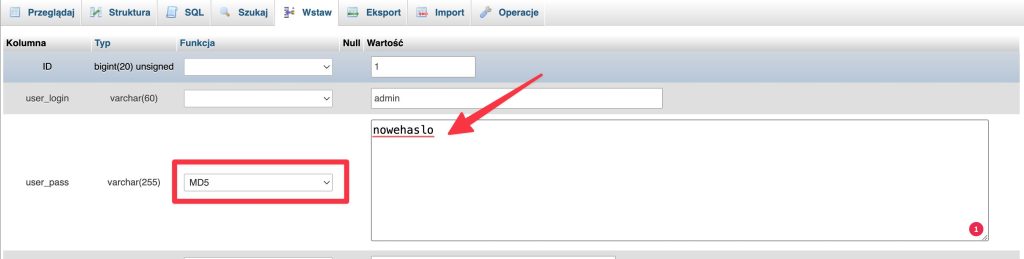 Następnie w kolumnie user_pass wprowadzamy w „Wartość” nowe hasło. Musimy pamiętać, aby w „Funkcja” wybrać MD5. Aby utworzyć trudne hasło, możemy skorzystać z generatorów haseł dostępnych w internecie.