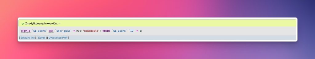 Po wprowadzeniu danych możemy zapisać zmianę, klikając „Wykonaj” na dole strony. Otrzymamy komunikat, który potwierdzi nam poprawną modyfikację rekordów w bazie danych.