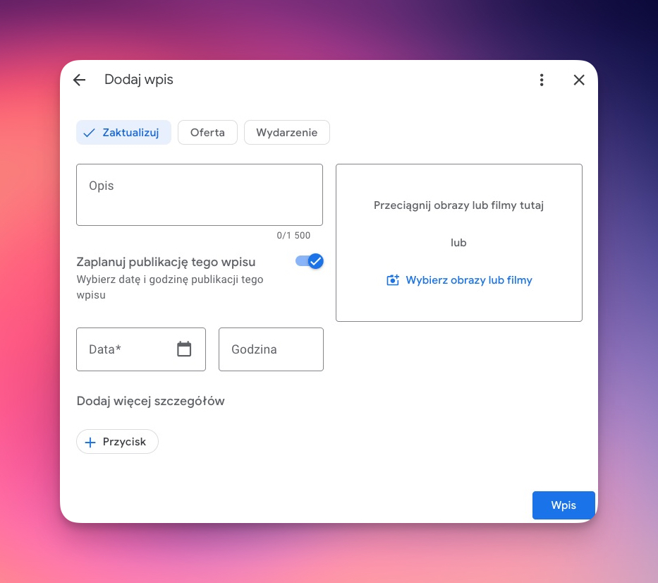 Opcja planowania wpisów w Profil Firmy w Google