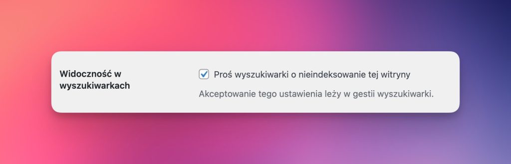 Zaznaczenie tej opcji w ustawieniach WordPressa dodaje do witryny tag NOINDEX, NOFOLLOW. Jest to sygnałem dla robotów wyszukiwarek, aby nie indeksowały tej strony i nie podążały za linkami na niej. Stosuje się to najczęściej na etapie tworzenia witryny, aby w Google nie zaindeksowała się wersja deweloperska strony w trakcie, gdy dopiero ją redagujemy.