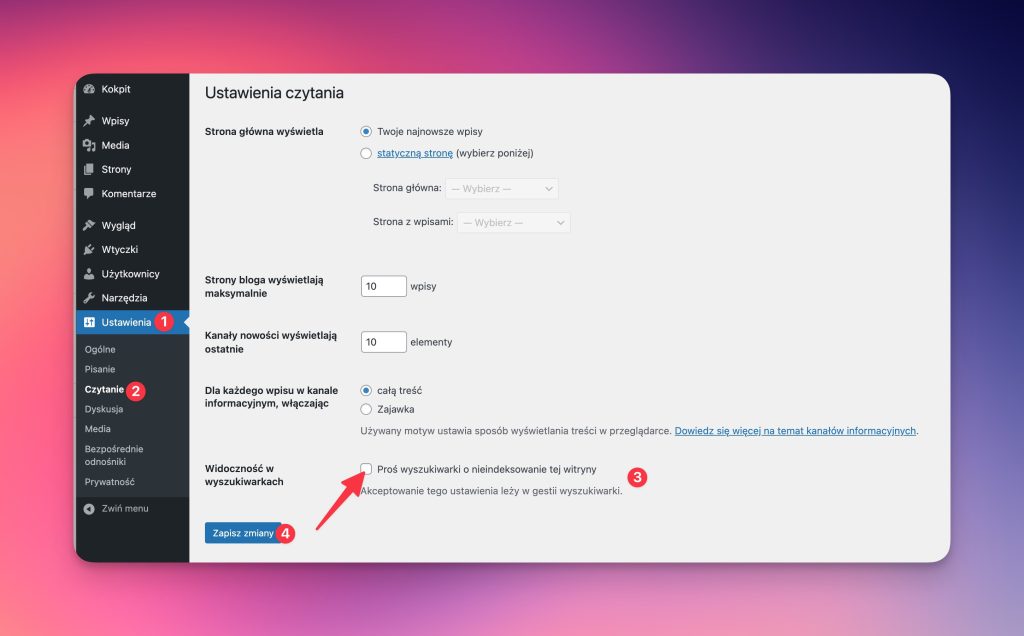 <meta name="robots" content="noindex, nofollow">Musimy więc przejść do naszego panelu administracyjnego WordPress. Następnie wejść do sekcji Ustawienia i Czytanie i odznaczyć opcję „Proś wyszukiwarki o nieindeksowanie tej witryny”.